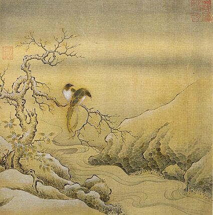 雪后溪邊,天色晦冥,老梅初放。樹棲綬帶鳥一雙,毛羽絢爛。樹下溪流湍急,水花飛濺。岸石上覆蓋積雪,畫家以水墨烘染陰天,以白粉表現(xiàn)積雪,以流暢的曲線描繪流水,最為獨(dú)特的是為了表現(xiàn)溪岸巖石為水沖蝕形成的蜂窩之狀,另創(chuàng)皴法,前此未見。