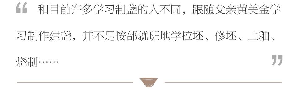看到父親燒盞起早貪黑或是日夜顛倒,看窯時專心致志廢寢忘食,完美出品時的欣喜若狂,對比著次品時的默然落寞,這些辛苦和得失似乎自已也可以接受和承受?;蚴悄晟偾嗫窕蚴侵蓺馕疵?,多年跟隨父親打下手,黃文勇自識吃苦耐勞的能力已然超過自已的年紀了,可以承受更多和更進一步。
