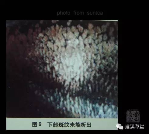 就兔毫來說,兔毫的斑紋好比水中的魚草,在水淺處魚草會(huì)被頂出水面,在水深處就沉在水中。所以兔毫斑紋一般在碗上部很密集并突出釉面,在下部較稀疏,沉在釉中,似隱似現(xiàn)(圖8)。斑紋的浮沉程度不同,所受的氧化程度就不同,使得斑紋的形態(tài)和色彩都有所不同。斑紋形態(tài)和色彩的變化,從審美角度看似是好事,但實(shí)際變化的結(jié)果很難令人滿意。往往是上部斑紋過密,下部斑紋過稀或無斑紋?;蛘呤峭肷喜堪呒y都變灰色了,下部斑紋還不能析出(圖9)。宋徽宗趙佶在《大觀茶論》中記載的:“盞色貴青黑,玉毫條達(dá)者為上”,指得是銀色的兔毫,從上到下,流暢通達(dá)的為上品。
