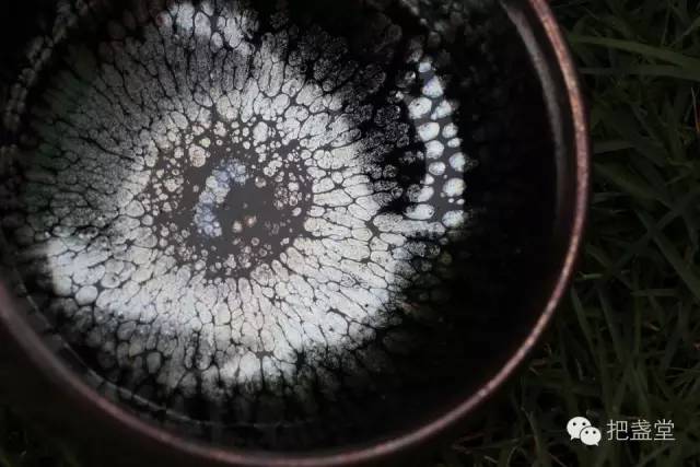 “具有銀色、銀蘭色、金黃、彩色的斑紋在陽光照射下會明顯放出異彩,這種質(zhì)感是高品位建盞獨(dú)有的,具有攝人心魄之美,宋代斗茶就是“取其燠發(fā)茶采色也”?!?/p>