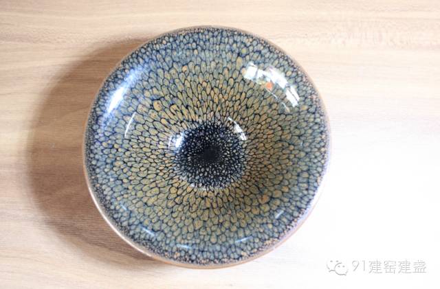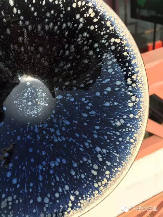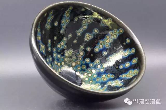 4、曜變釉:曜變天目是瓷器家族里特殊的成員,也是最為珍貴的品種。曜變天目的燒制極具偶然性。曜變天目在黑釉中浮現(xiàn)著大大小小的斑點,圍繞這些斑點周圍有紅、綠、藍等色彩光暈在陽光下閃耀著。從整體看,會隨著觀察角度的不同出現(xiàn)不同的色彩變化,如浩瀚宇宙,令人遐想。天目瓷器中以曜變、油滴、兔毫最為名貴,而曜變居于諸名瓷之首。