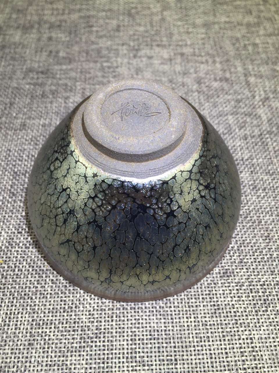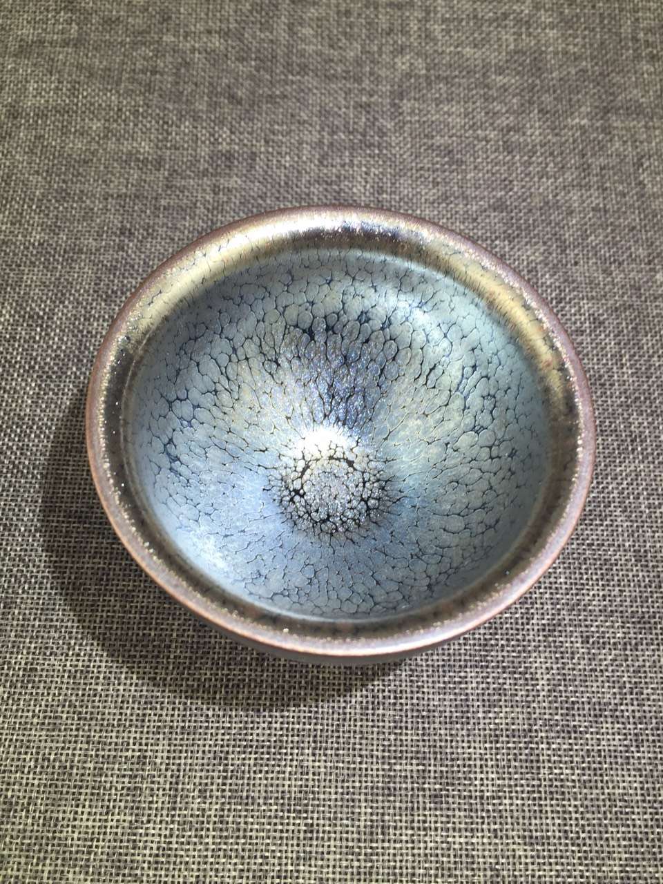 廖成軍斗笠藍(lán)釉銀油滴盞純手工拉胚口徑9.5×4.8公分