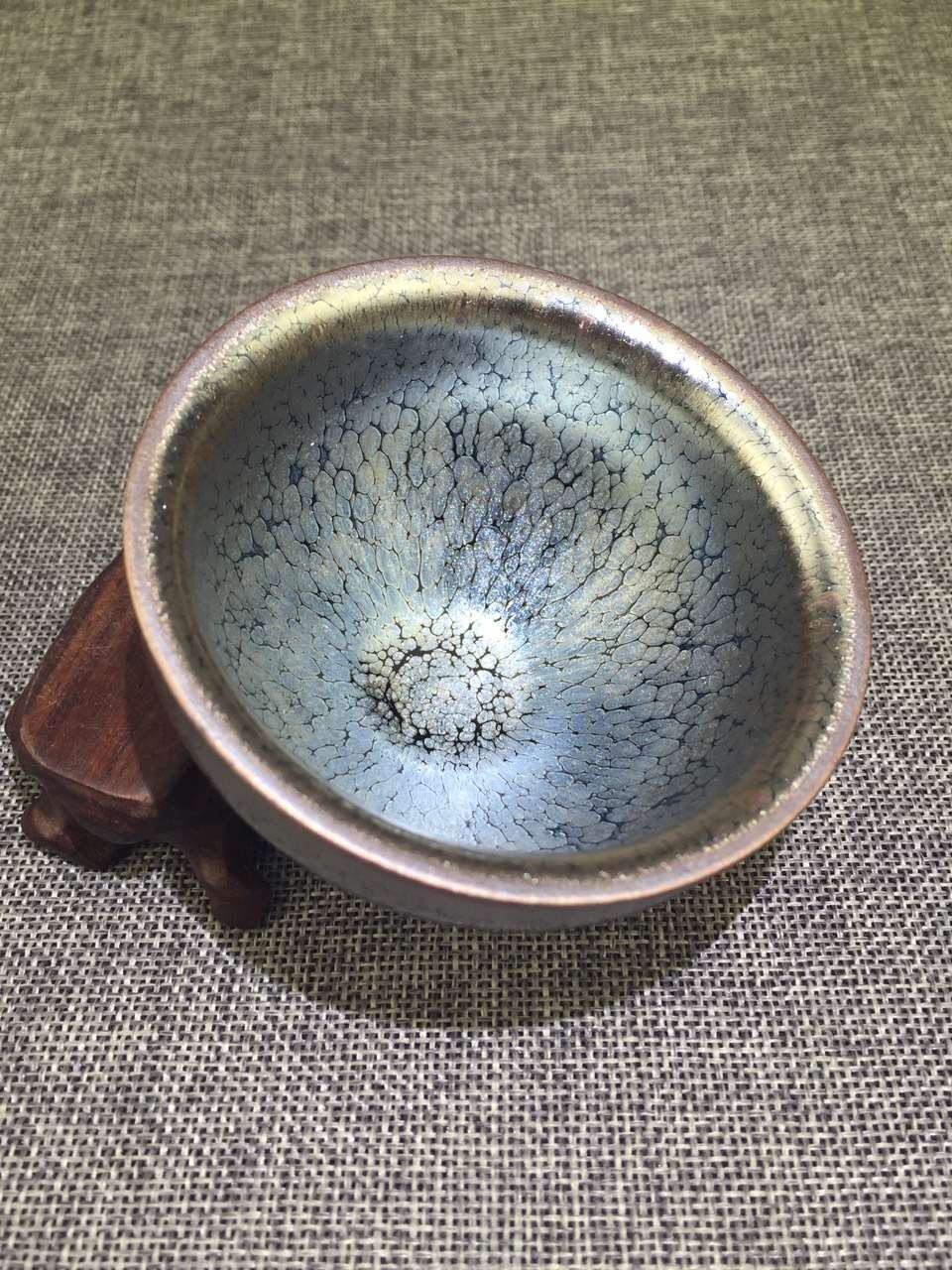 廖成軍斗笠藍釉銀油滴盞純手工拉胚口徑9.5×4.8公分