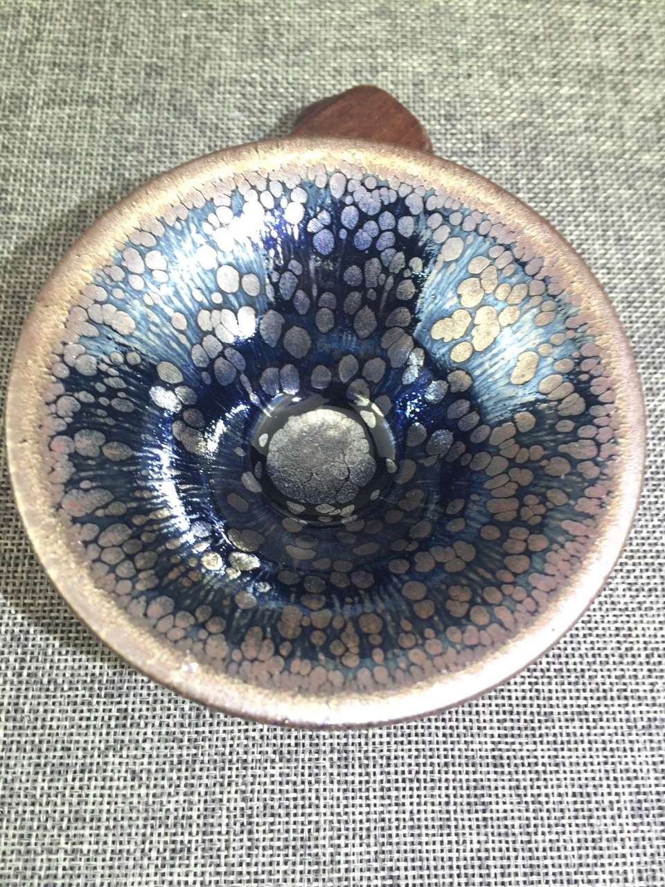 廖成軍斗笠藍(lán)釉銀油滴盞純手工拉胚口徑9.5×4.8公分