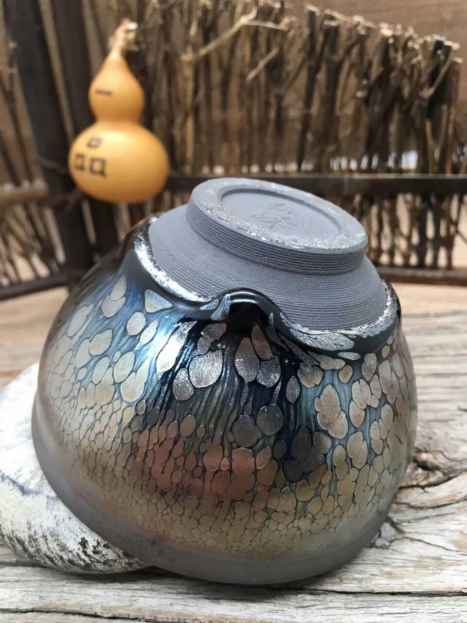李光熙師傅精品孔雀開屏藍油滴盞口徑9.5肚大10高5.5cm