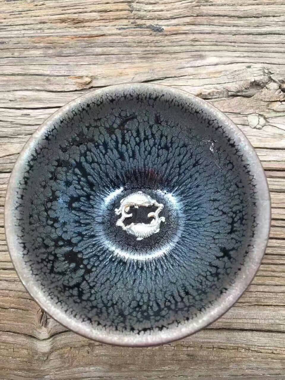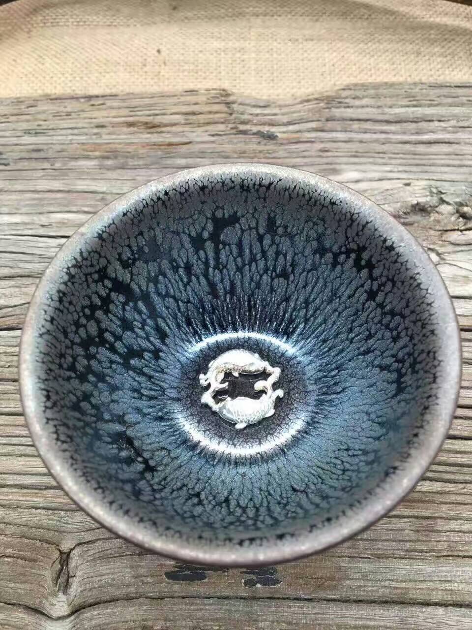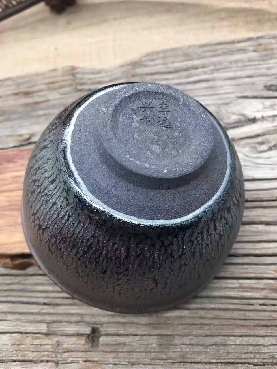 李遠興師傅精品銀藍油滴束口盞口徑8.8高5.2