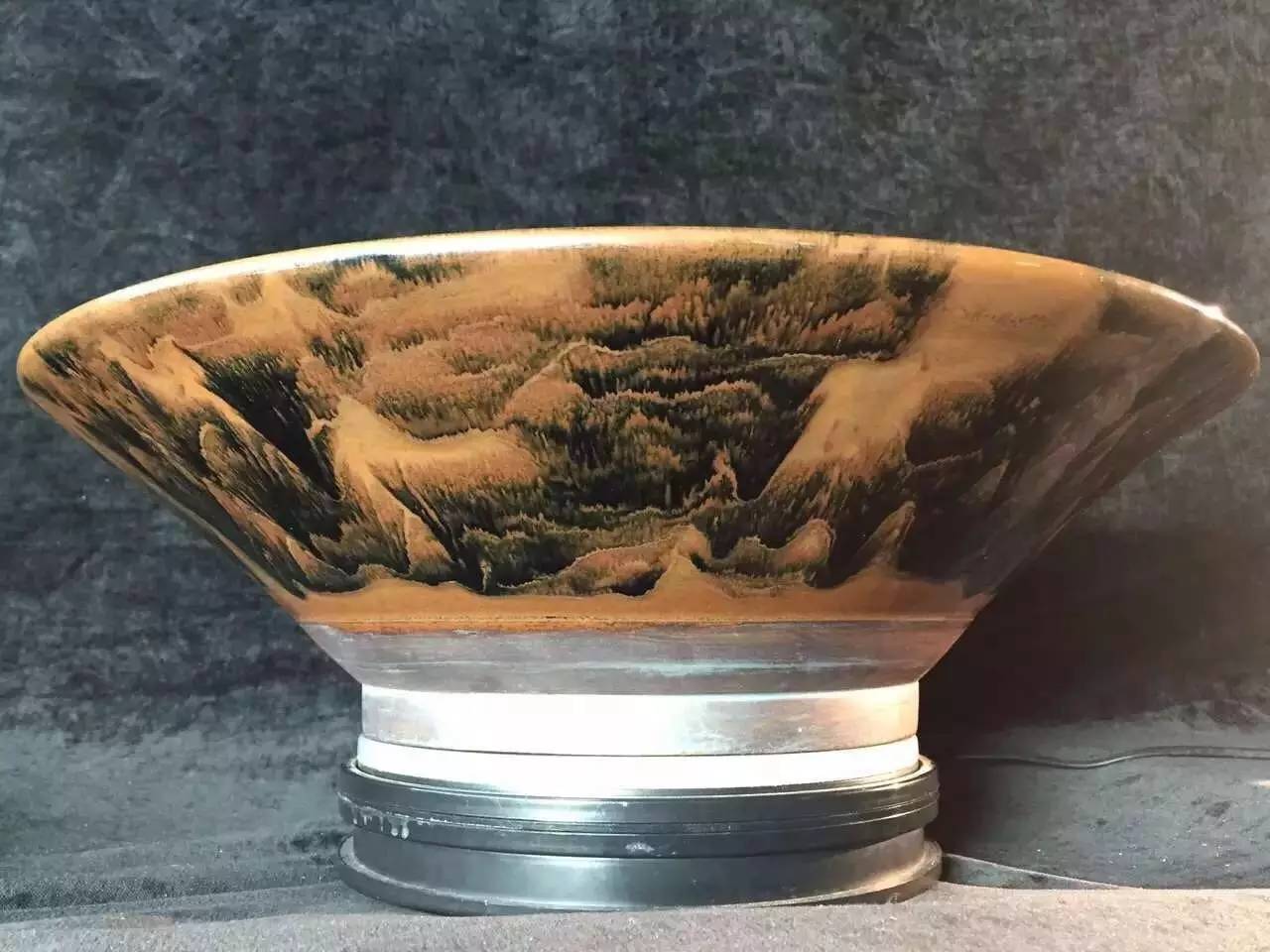 也許那時(shí)她并不知道,這有多難。在我和她交流的過(guò)程中沒(méi)有發(fā)現(xiàn)一絲后悔的表情,反而極興奮地向我介紹他的最新作品,這只作品,吸引了福建省臺(tái)的記者專(zhuān)程來(lái)探訪,這只作品的尺寸極大,達(dá)到驚人的49CM,了解建盞的朋友都知道,建盞由于泥的粘性及燒制的原因,越大的尺寸其實(shí)越難燒制,從斑紋看,山巒起伏,宛如一幅山水國(guó)畫(huà)般精美。正如其名“群峰竟秀”一般,露出云層的群山似島嶼般一簇簇一抹抹的懸浮著。