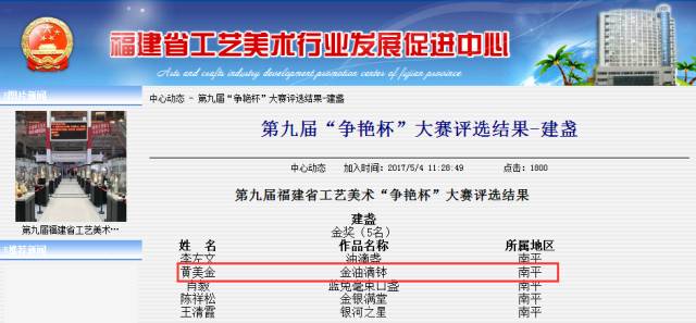 2017年4月28日至5月2日,第十二屆中國(guó)(莆田)海峽工藝品博覽會(huì)在莆田工藝美術(shù)城來開帷幕,第九屆福建省工藝美術(shù)精品“爭(zhēng)艷杯”大賽同步開賽。黃美金金油滴,第九屆福建省工藝美術(shù)精品“爭(zhēng)艷杯”大賽再獲大賽金獎(jiǎng)!