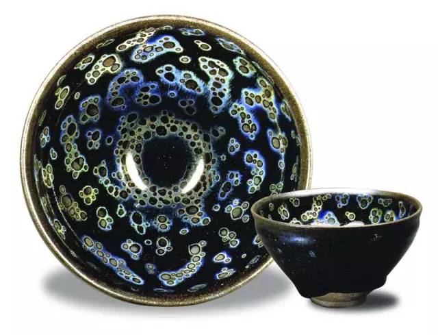 建盞看似普通,然則單純不單調(diào),樸素不粗鄙,禁得住時(shí)時(shí)細(xì)品,耐得了日日把玩。釉色深沉瑩潤,適合點(diǎn)茶茗戰(zhàn)。斑紋樸素平和,但變化萬端,各種名品,不一而足。特別是有一種曜變斑,夢幻如宇宙星空,藍(lán)光閃耀,使人不勝冥想,如癡如醉。后有兩只曜變盞東流日本,為當(dāng)時(shí)的日本霸主織田信長所得,視若珍寶。相傳一只毀于本能寺之變,與織田信長一道殞命,另一只流傳至今,被奉為日本國寶。