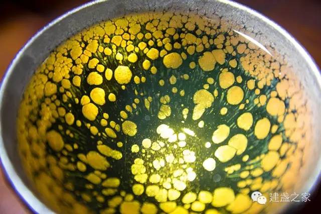那么這黑黑的小碗又好在哪里呢?建盞乍看黯淡,但是細(xì)觀會(huì)發(fā)現(xiàn)青黑的釉面光亮如墨玉,靈動(dòng)的紋樣或如兔毫,或如銀萍,或如星辰,或如山海,耐人玩味,大可神游!只有深入欣賞才能發(fā)現(xiàn)它的華麗。宋人欣賞建盞會(huì)在陽光下側(cè)看,這樣才能比較清楚地看到引人入勝的花紋。而現(xiàn)在,我們大可以借助放大鏡,輕易地進(jìn)入建盞的絢麗世界,不過出來時(shí)往往會(huì)因流連太久而頭暈眼花。