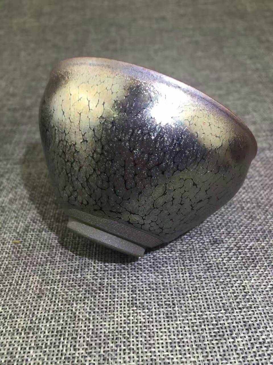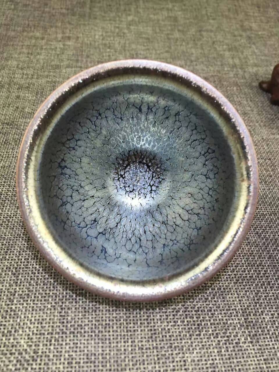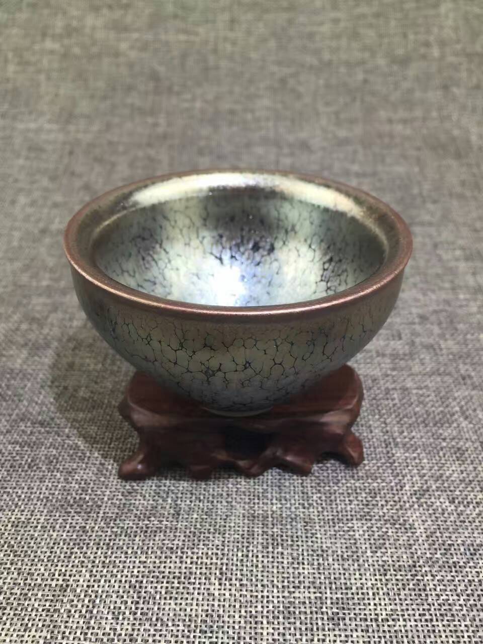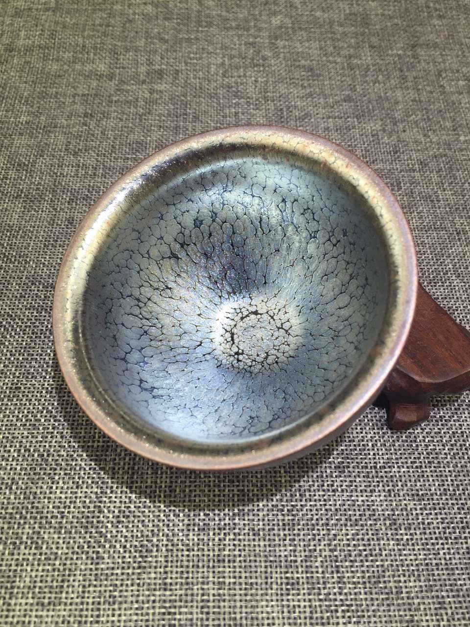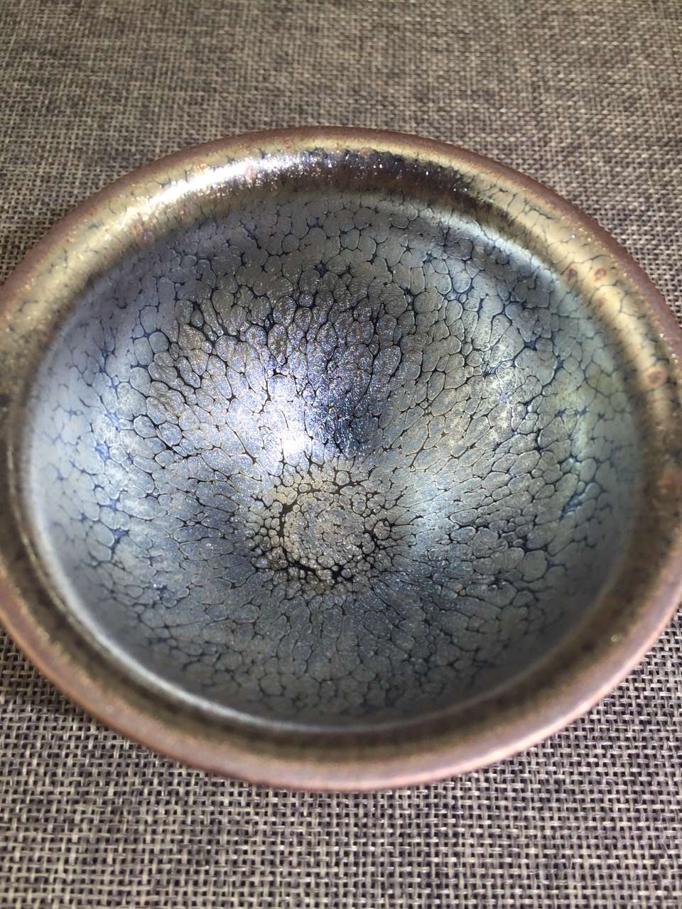廖成軍斗笠藍釉銀油滴盞純手工拉胚口徑9.5×4.8公分