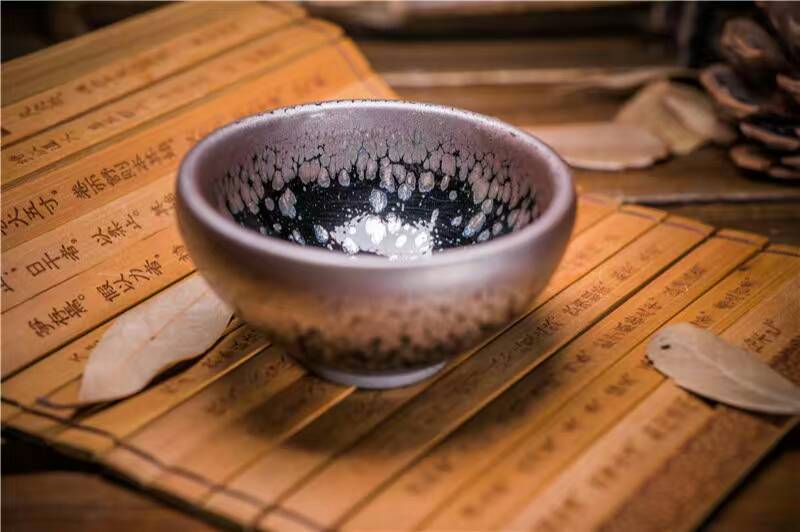 陳艗束口油滴盞帶釉淚口徑8.2×5公分
